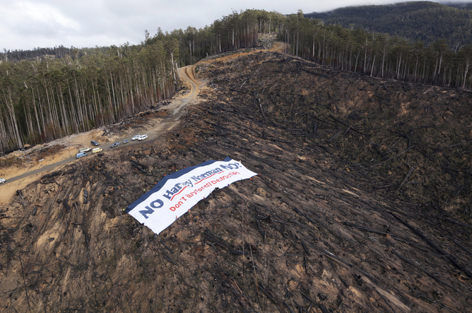 Supplied photo of anti-logging banner displaying the words No Harvey Norman No in Tasmania, Monday, Aug. 15, 2011. Environmentalists claim retailer Harvey Norman are profiting from the destruction of Australia?s world class native forests and that prime habitat areas in Tasmania?s native forests are being destroyed. (AAP Image/The Last Stand/Matthew Newton) NO ARCHIVING, EDITORIAL USE ONLY