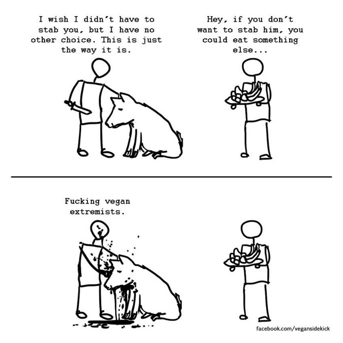 Vegan – cartoon extremists don’t have to stab Mon 23 Nov 2015 682 × 682 Vegan Ammunition Meme Gallery ShareTweetShare on Tumblr Share on Reddit (Opens in new window) Reddit Share on WhatsApp (Opens in new window) WhatsApp Share on Telegram (Opens in new window) Telegram Email a link to a friend (Opens in new window) Email Print (Opens in new window) Print Like Loading...